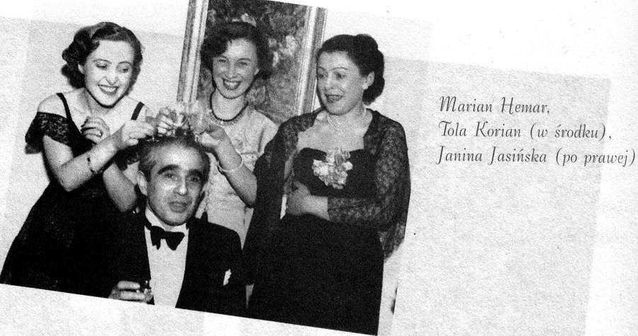 JJ: Hemar był bardzo trudny, uszczypliwy, złośliwy i wymagający. Wszystko musiało być tak, jak on chciał i każdy musiał się temu podporządkować. Kiedyś Malicz powiedział, że „po scenie chodzą same Hemary”. To o czymś świadczy. Ale on nas wiele nauczył. Zwracał uwagę na piękny język, piękną składnię i jak w dramatycznym teatrze, wszystko musiało mieć swoje miejsce. Pamiętam jak zwracał mi uwagę – nie takim pięknym głosikiem śpiewaj, Jasiuniu. Bał się, że publiczność zwróci uwagę na mój „piękny głosik” i umkną wtedy jego intelektualne teksty, bał się o każde słowo.